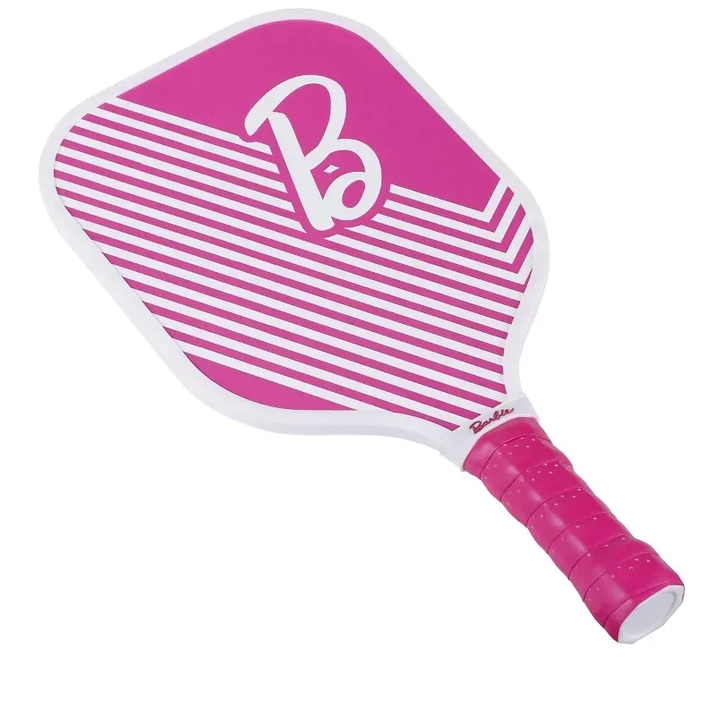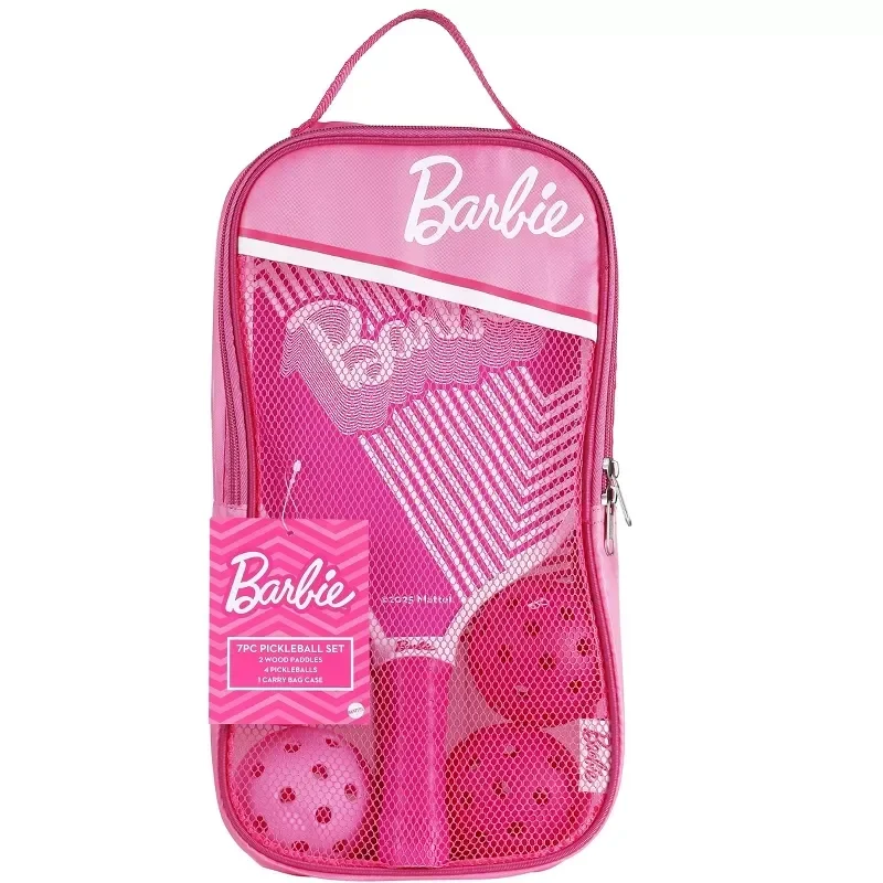 Barbie seven piece pickleball set two wood pedals for pickleballs and carrying bag Case